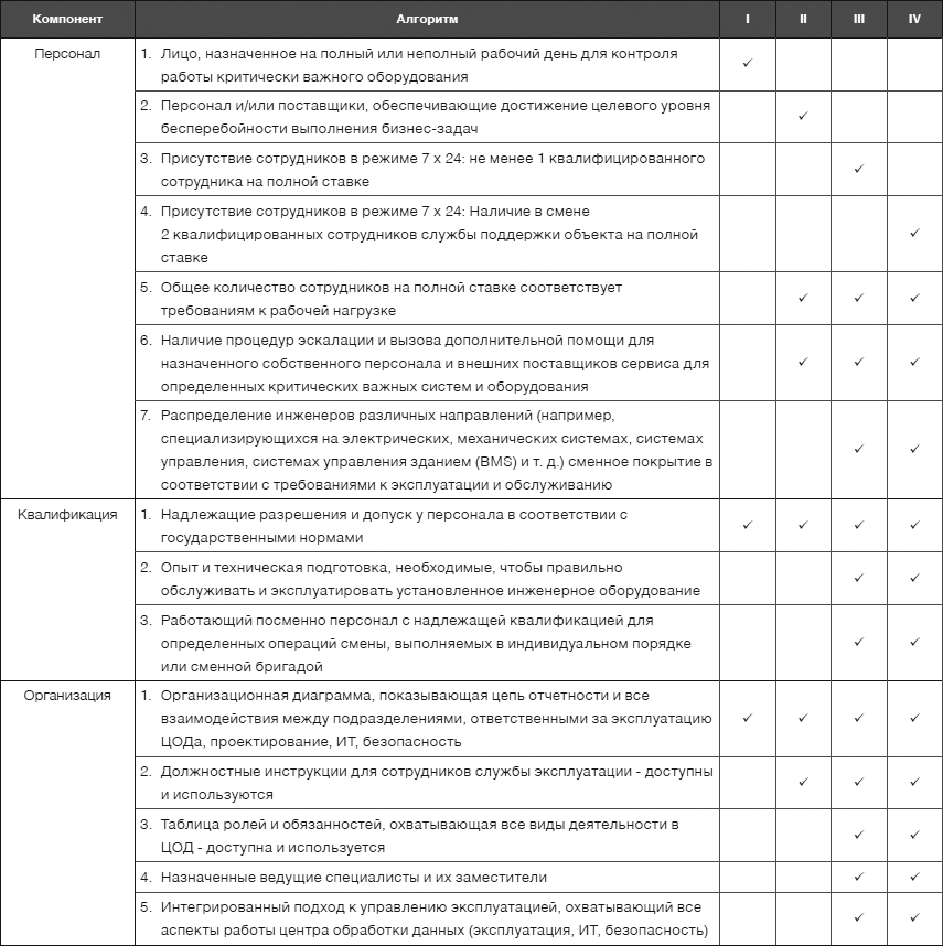Например, так выглядит категория подбора персонала и организационной структуры для уровней Tier I, II, III и IV: