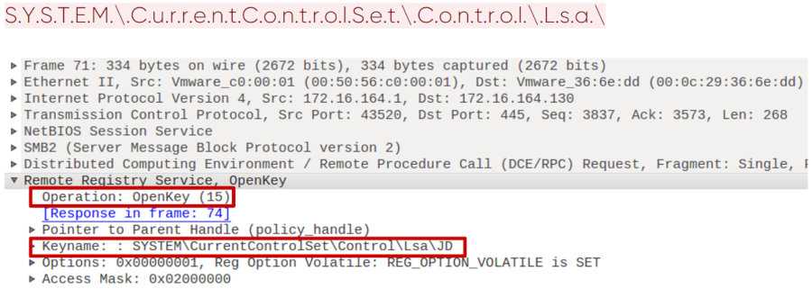 На картинке ниже мы видим, как именно при использовании протокола winreg происходит получение доступа по ключу реестра с LSA. Для этого используется команда DCERPC с opcode 15 — .