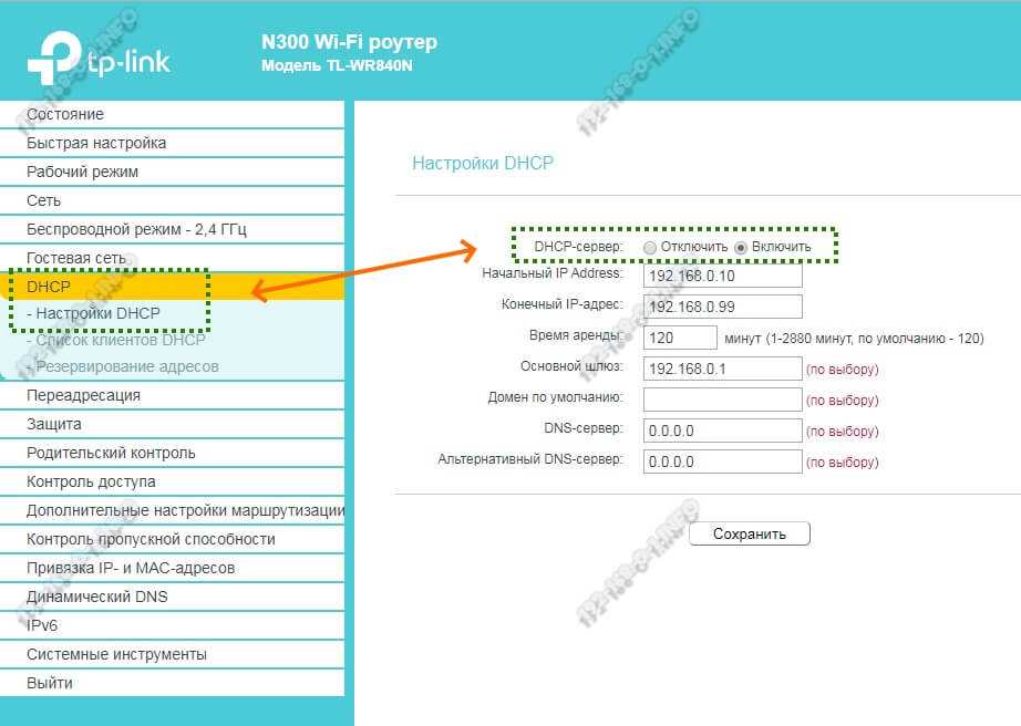 Первым делом Вы должны попасть в настройки своего WiFi-роутера. Сделать это можно либо с компьютера, введя в браузере его локальный IP (обычно это 192.168.1.1 или 192.168.0.1). После авторизации необходимо в главном меню веб-интерфейса найти раздел, отвечающий за локальную сеть (LAN). В некоторых случаях, как в моём примере, настройка DCHP на роутере выведена в отдельный раздел: