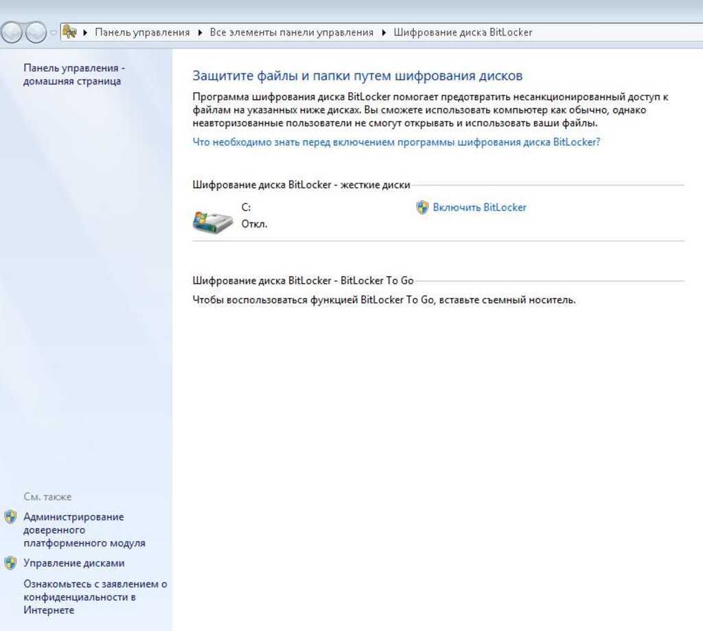 Наконец, если вы до конца все-таки не уверены, что есть криптопроцессор, попробуйте установить BitLocker, который только и функционирует с этой технологией. В процессе настройки шифрования утилита укажет вам на отсутствие TPM.