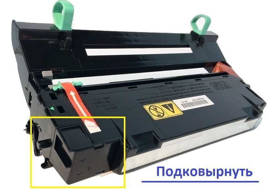 - Дальше идет фотобарабан, который вытягиваем за зеленные ручки, чтобы не повредить поверхность.