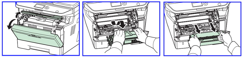 Чтобы добраться до драма, следует открыть крышку принтера Kyocera и достать используемый расходник.