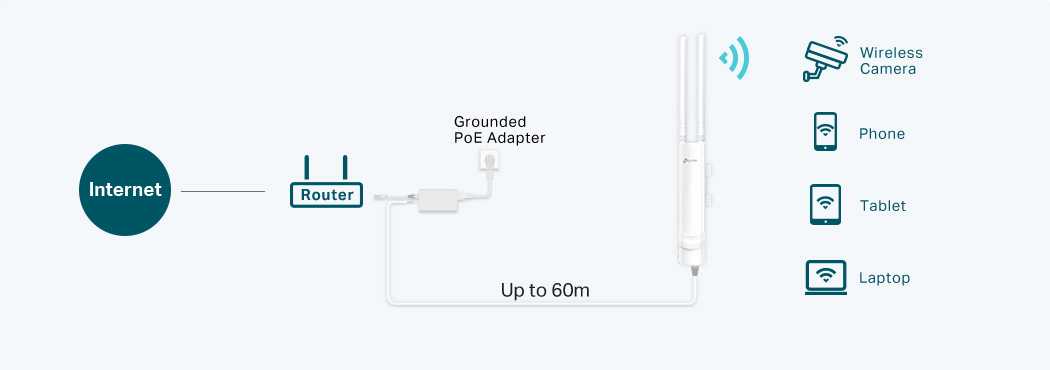 Для небольших и домашних офисов обычно развертывается одна наружная точка доступа для подключения беспроводных камер, телефонов, планшетов и ноутбуков. С помощью входящего в комплект пассивного адаптера PoE подключите точку доступа Omada к существующему маршрутизатору для одновременной передачи данных и питания с помощью одного кабеля Ethernet.