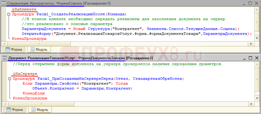 После создания тонкого клиента программный код всегда разделяется на клиентскую и серверную части. И хотя структура клиент-сервер была встроена в платформу с версии 8.0, то строгого разделения кода не потребовалось, так как был только один режим клиентского приложения — аналог толстого клиента — и возможности были такими же на платформе серверная и клиентская сторона.