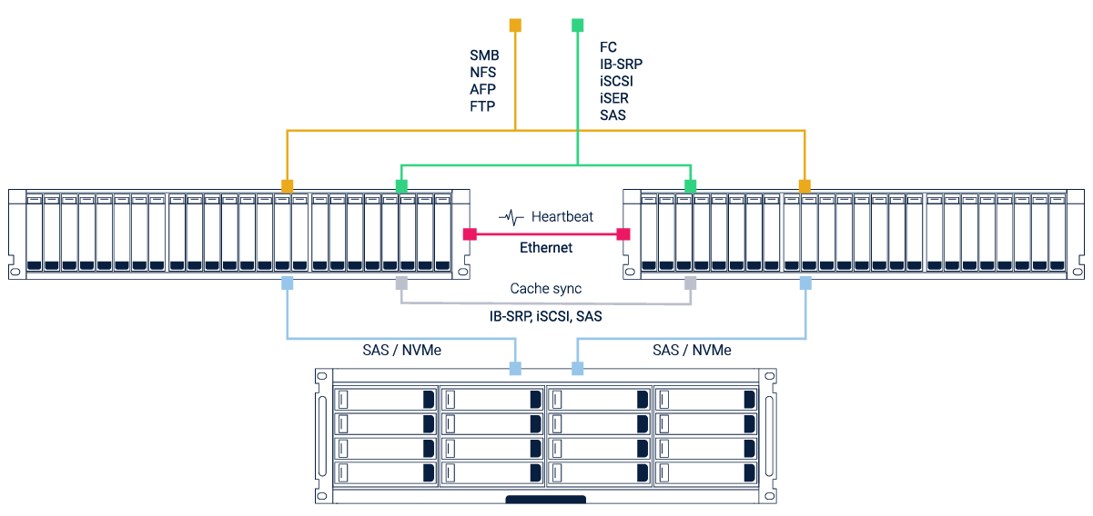 - Синхронизация кэша (Cache sync) — соединение для синхронизации кэша на основе протоколов IB-SRP, iSCSI или SAS.