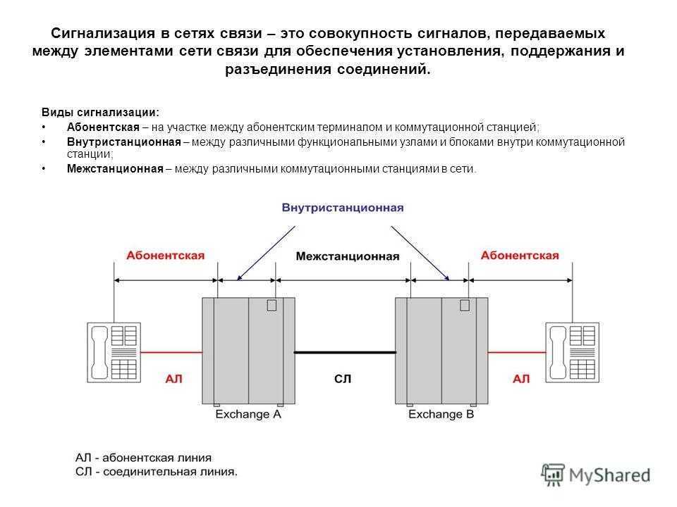 Сигнализация в сетях связи – это совокупность сигналов, передаваемых между элементами сети связи для обеспечения установления, поддержания и разъединения соединений. Виды сигнализации: Абонентская – на участке между абонентским терминалом и коммутационной станцией; Внутристанционная – между различными функциональными узлами и блоками внутри коммутационной станции; Межстанционная – между различными коммутационными станциями в сети.