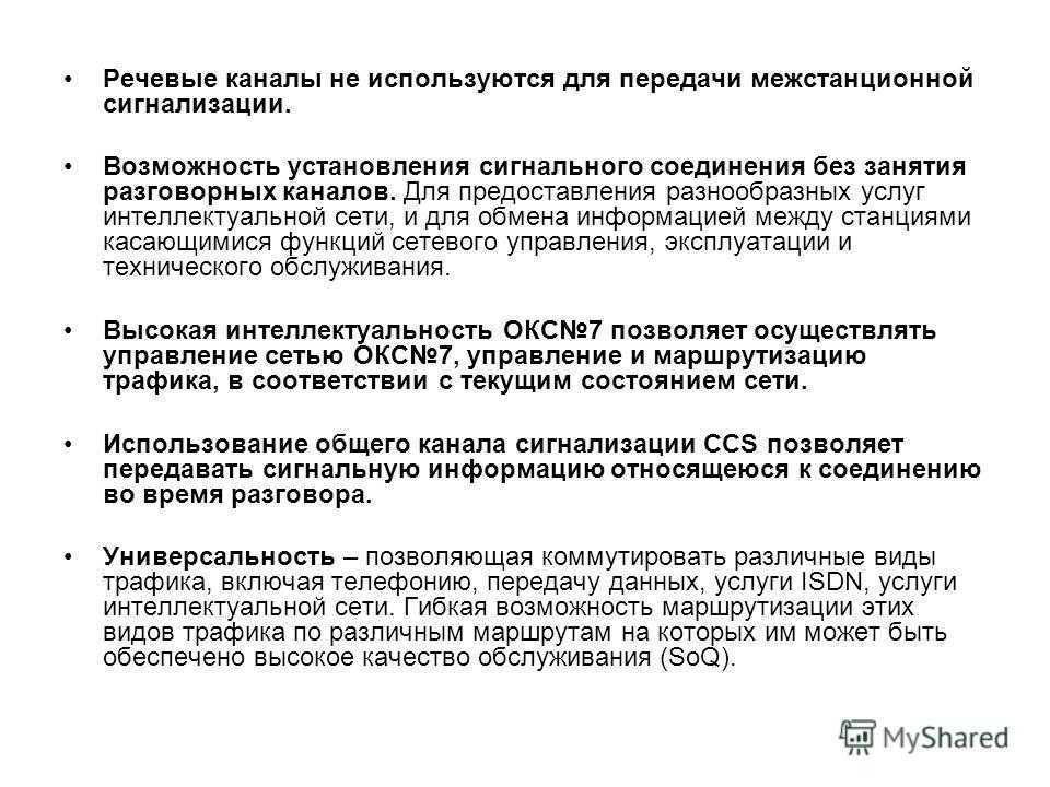 Речевые каналы не используются для передачи межстанционной сигнализации. Возможность установления сигнального соединения без занятия разговорных каналов. Для предоставления разнообразных услуг интеллектуальной сети, и для обмена информацией между станциями касающимися функций сетевого управления, эксплуатации и технического обслуживания. Высокая интеллектуальность ОКС7 позволяет осуществлять управление сетью ОКС7, управление и маршрутизацию трафика, в соответствии с текущим состоянием сети. Использование общего канала сигнализации CCS позволяет передавать сигнальную информацию относящеюся к соединению во время разговора. Универсальность – позволяющая коммутировать различные виды трафика, включая телефонию, передачу данных, услуги ISDN, услуги интеллектуальной сети. Гибкая возможность маршрутизации этих видов трафика по различным маршрутам на которых им может быть обеспечено высокое качество обслуживания (SoQ).