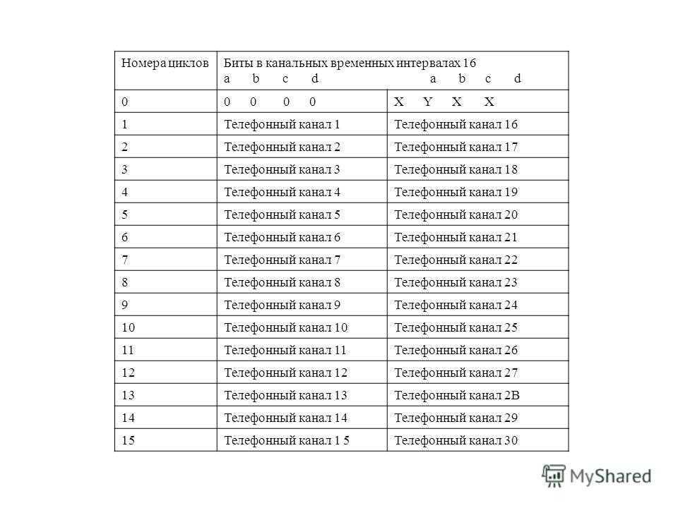 Номера цикловБиты в канальных временных интервалах 16 a b с d 00 0 X Y X X 1Телефонный канал 1Телефонный канал 16 2Телефонный канал 2Телефонный канал 17 3Телефонный канал 3Телефонный канал 18 4Телефонный канал 4Телефонный канал 19 5Телефонный канал 5Телефонный канал 20 6Телефонный канал 6Телефонный канал 21 7Телефонный канал 7Телефонный канал 22 8Телефонный канал 8Телефонный канал 23 9Телефонный канал 9Телефонный канал 24 10Телефонный канал 10Телефонный канал 25 11Телефонный канал 11Телефонный канал 26 12Телефонный канал 12Телефонный канал 27 13Телефонный канал 13Телефонный канал 2В 14Телефонный канал 14Телефонный канал 29 15Телефонный канал 1 5Телефонный канал 30
