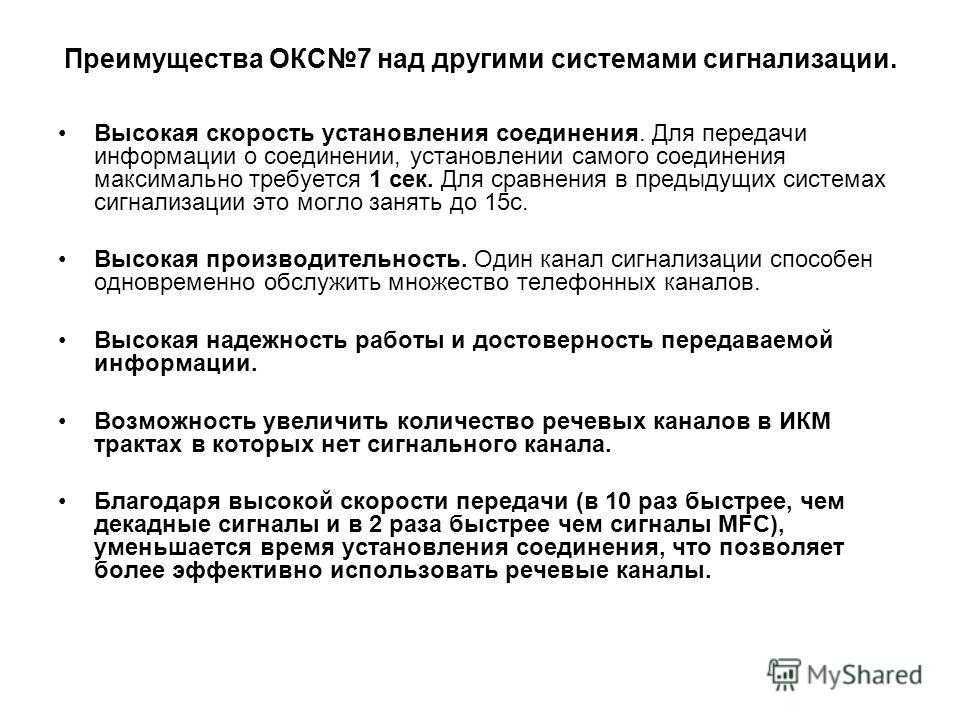 Преимущества ОКС7 над другими системами сигнализации. Высокая скорость установления соединения. Для передачи информации о соединении, установлении самого соединения максимально требуется 1 сек. Для сравнения в предыдущих системах сигнализации это могло занять до 15с. Высокая производительность. Один канал сигнализации способен одновременно обслужить множество телефонных каналов. Высокая надежность работы и достоверность передаваемой информации. Возможность увеличить количество речевых каналов в ИКМ трактах в которых нет сигнального канала. Благодаря высокой скорости передачи (в 10 раз быстрее, чем декадные сигналы и в 2 раза быстрее чем сигналы MFC), уменьшается время установления соединения, что позволяет более эффективно использовать речевые каналы.