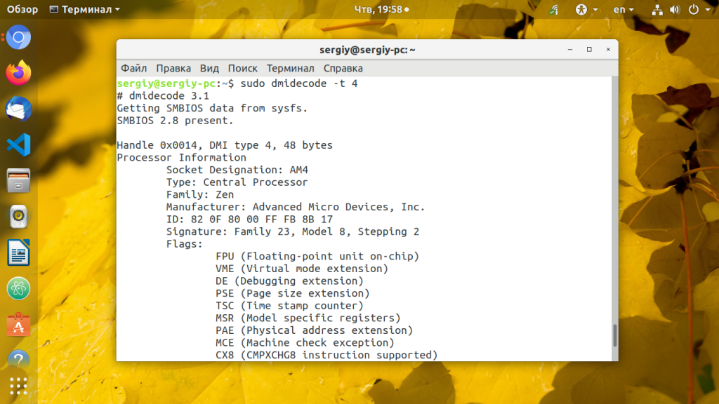 Утилита dmidecode собирает подробную информацию об оборудовании системы на основе данных DMI в BIOS. Отображаемая информация включает производителя, версию процессора, доступные расширения, максимальную и минимальную скорость таймера, количество ядер, конфигурацию кэша L1/L2/L3 и т д. Здесь информация о процессоре Linux намного легче читается чем у предыдущей утилиты.