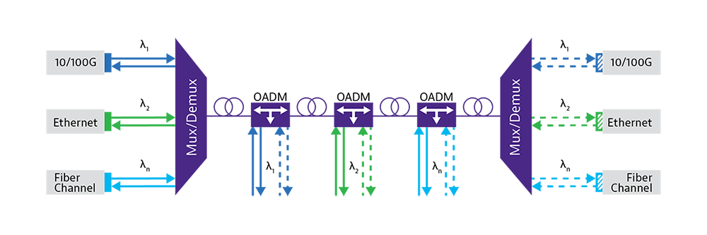 An Optical Add Drop Multiplexer (OADM) is an optional component of DWDM architecture that can be added to either passive or active networks to facilitate the addition or subtraction of a specified wavelength from a mid-stream location on the main/core/common DWDM fiber. Bidirectional architecture includes transmitters and receivers at both ends of the circuit as well as combination MUX/De-MUX devices.