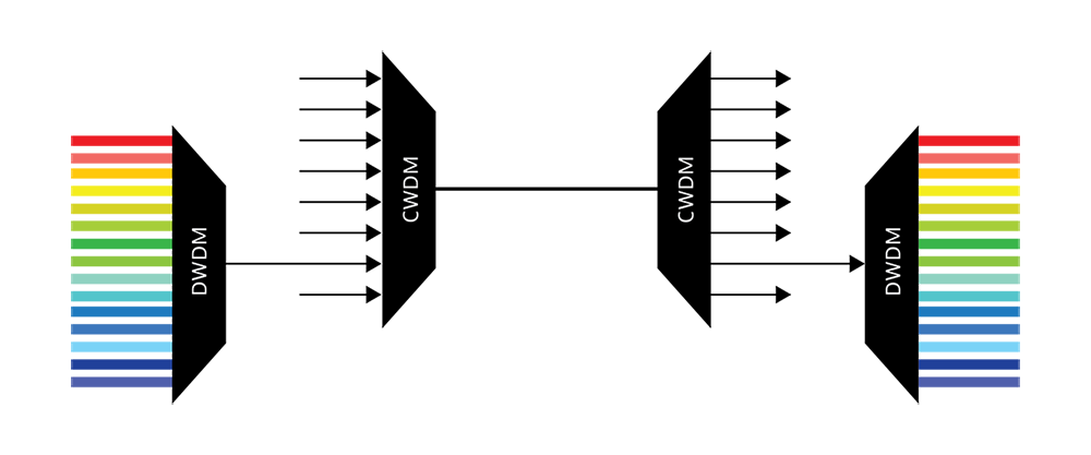 Because DWDM technology overlaps the CWDM frequency band, a “hybrid” solution can also be selected. This type of system leaves the CWDM MUX and deMUX hardware in place, inserting DWDM wavelengths on top of existing channels in the 1530 to 1550nm range, creating up to 28 additional channels. This type of hybrid system can provide a significant capacity boost without requiring new fiber installation or wholesale infrastructure changes for a company.