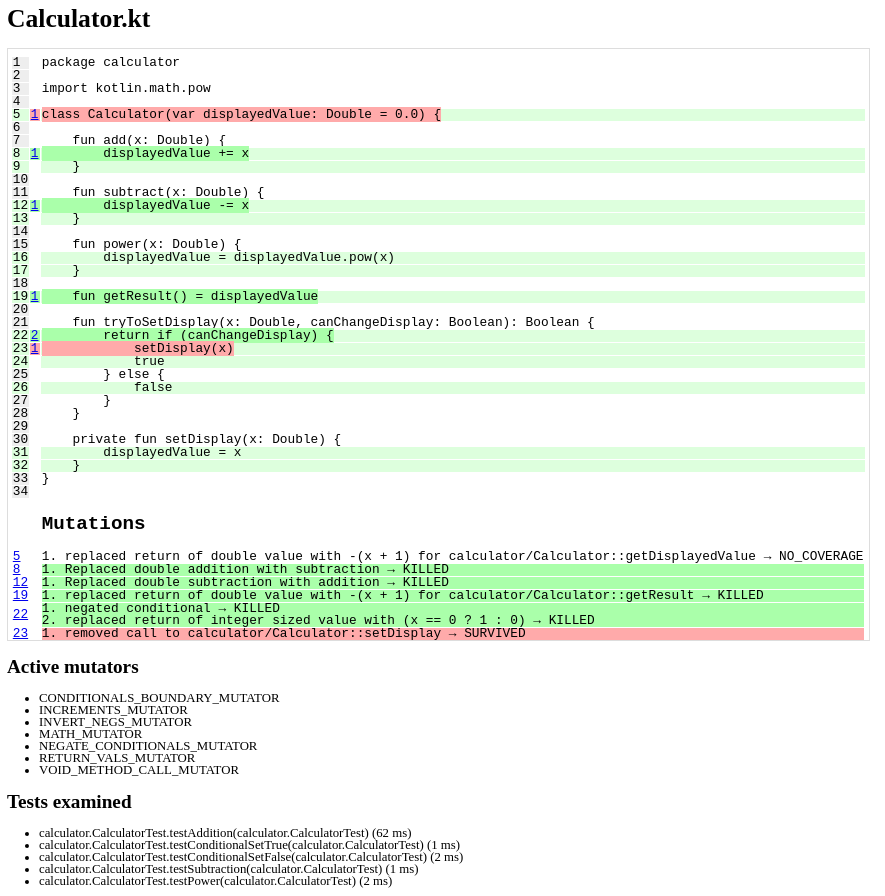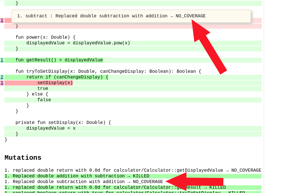 The examination above already integrated the check for subtraction function that we added. If we exam the code without this check, we would see that PITest doesn’t even try to mutate this line, because it already knows that no check will fail.