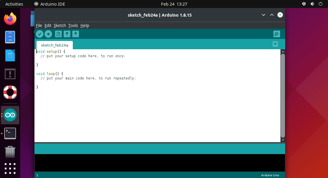 Start the Arduino IDE. You’ll find a launcher for this in your desktop environment’s application menu. The Arduino IDE presents you with the code of an empty software program, also called a sketch: