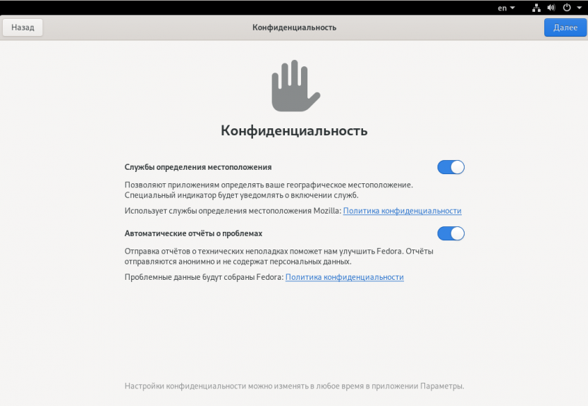 После перезагрузки система предложит настроить основные параметры. Выберите нужно ли включать сервисы определения местоположения и сообщать разработчикам о проблемах с системой: