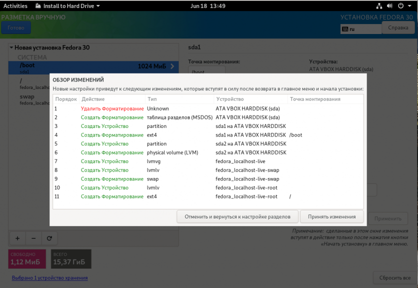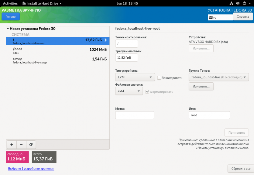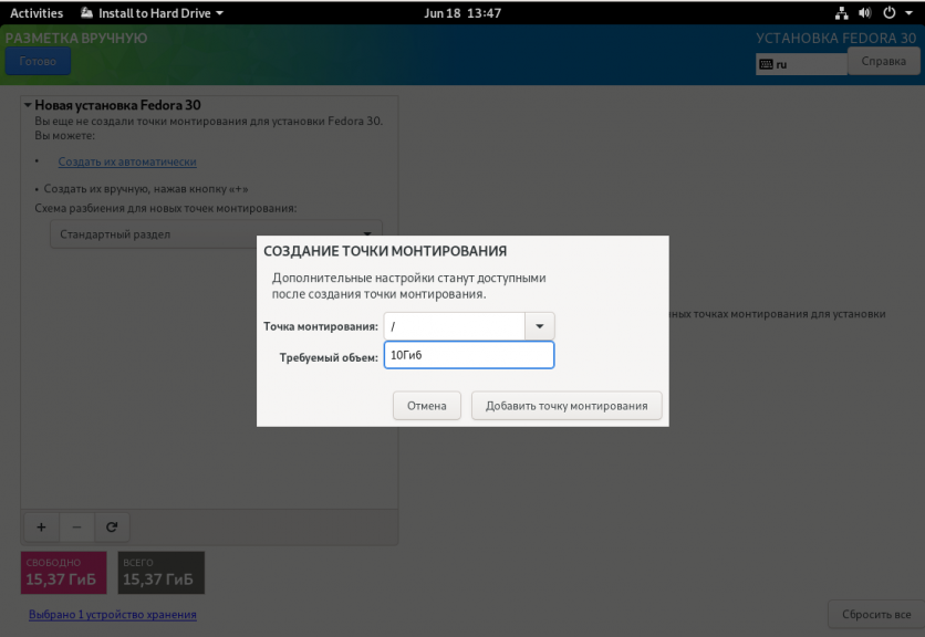 Затем нажмите кнопку Добавить точку монтирования. Вам нужно создать корневой раздел с точкой монтирования /, раздел для загрузчика — /boot и раздел подкачки, для последнего точка монтирования — swap. Размер корневого раздела не менее 10 Гигабайт, для /boot достаточно 1 гигабайта, а swap должен равняться половине размера вашей оперативной памяти, но не меньше четырех гигабайт.