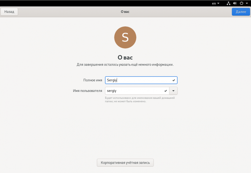 Введите имя пользователя и логин, от имени которого вы будете использовать систему:
