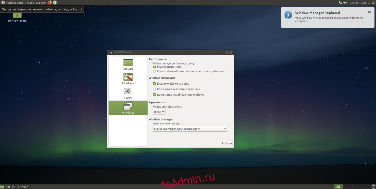 Чтобы включить композитинг Compton GPU, выберите раскрывающееся меню под «Window Manager», найдите «Marco (Compton GPU Compositor)» и выберите его, чтобы включить. Композиция должна начаться мгновенно. Если нет, перезагрузите компьютер. При входе в систему все должно работать.