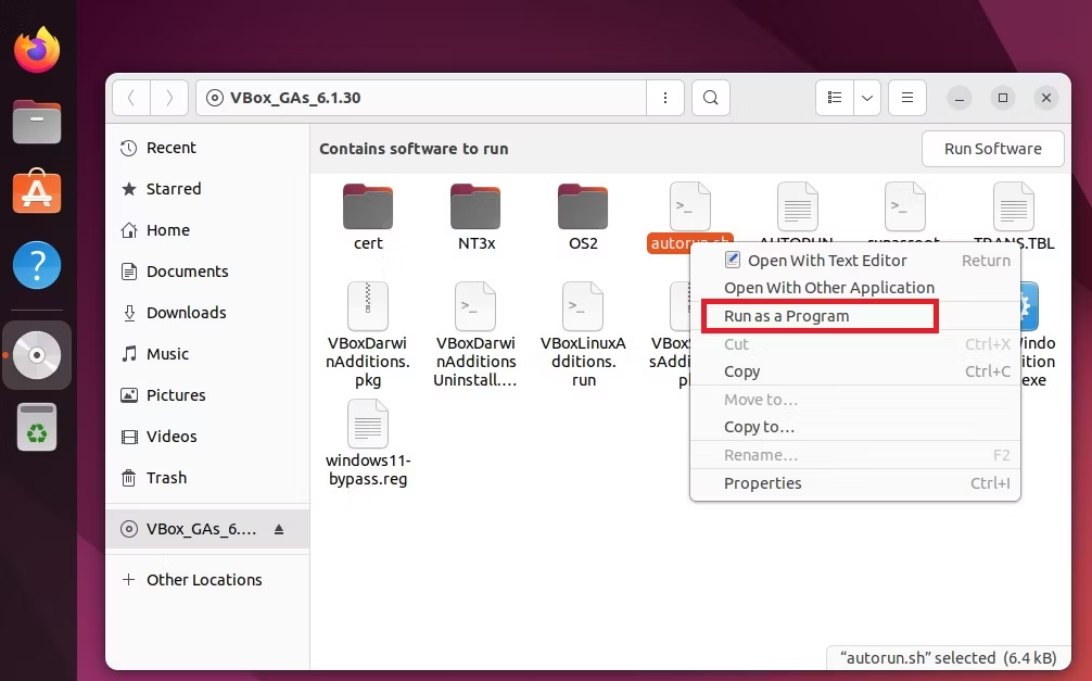 In the VM window, go to Devices and hit Insert Guest Additions CD image. The ISO disc image that is located in the VirtualBox installation directory will be inserted into a virtual CD/DVD drive of the VM. After that, you can see a CD shortcut on the Ubuntu Desktop. The ISO disk contains autorun, and the Guest Additions installer can be started automatically. Just hit the Run button to start installing VirtualBox Guest Additions.