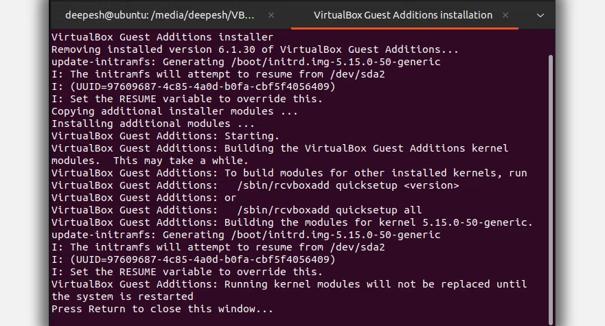 If you get the warning message “Please install the gcc make perl packages”, it means that you have to install these packages first and then install VirtualBox Guest Additions.