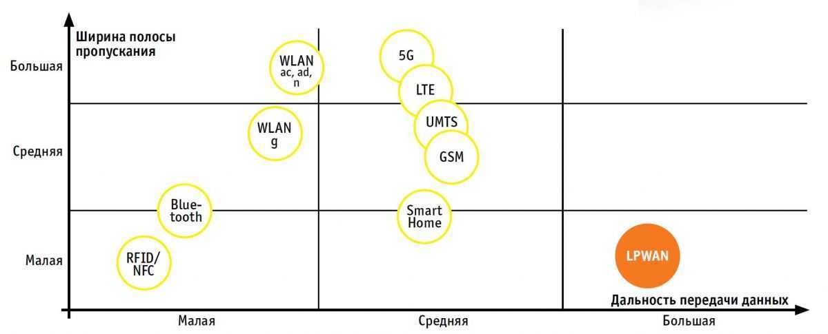 Большой радиус действия и экономия. Современные беспроводные стандарты, такие как WLAN, LTE или Bluetooth, не могут быть использованы для объединения миллиардов устройств в глобальную сеть. В сети LPWAN скорость передачи данных, которая намного ниже, чем у стандартов WLAN, позволяет добиться большей дальности распространения сигнала. А одна базовая станция способна поддерживать подключение множества устройств.