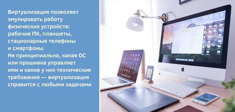 Виртуализация позволяет эмулировать работу физических устройств: рабочие ПК, планшеты, стационарные телефоны и смартфоны. Не принципиально, какая ОС или прошивка управляет ими и какие у них технические требования — виртуализация справится с любыми задачами.