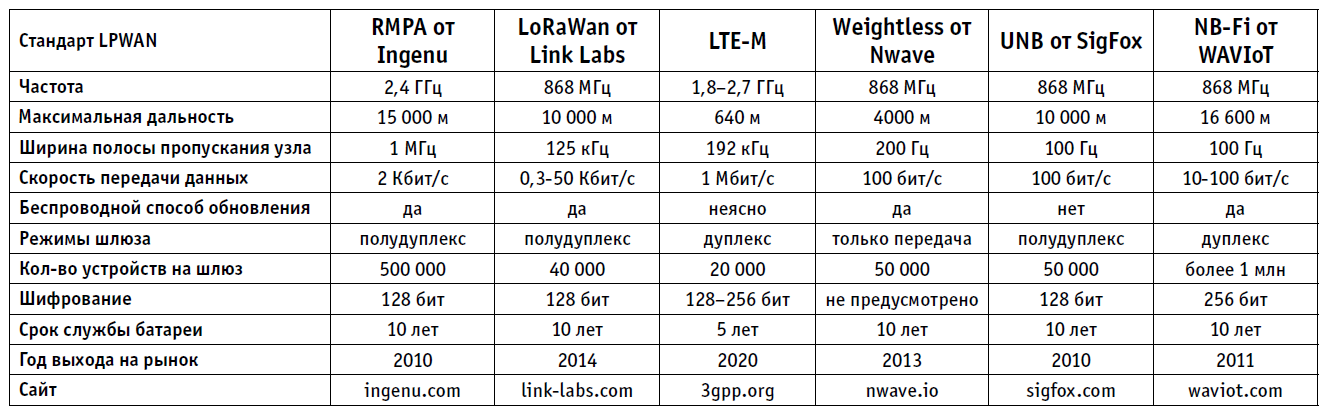 В таблице перечислены стандарты LPWAN, которые претендуют на первенство в этой категории. Структура этих сетей в основном схожа. С помощью датчиков к базовой станции (шлюзу) подключены устройства, образующие «звезду». Шлюзы собирают данные и передают их на серверы в фоновом режиме. Эти серверы в то же самое время являются точками доступа для пользователей.