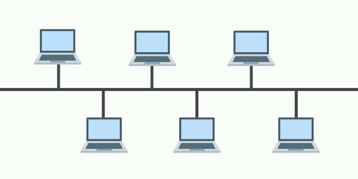 Меньшие сети с топологией этого типа используют коаксиальный кабель или кабель RJ45 для объединения устройств. Однако схема топологии шины устарела, и вы вряд ли встретите компанию, использующую топологию шины сегодня..