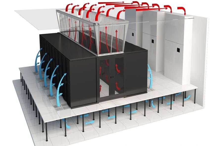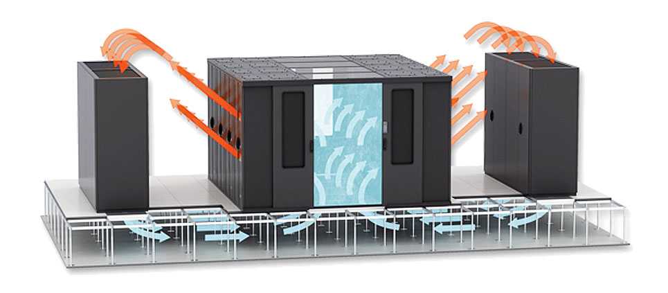 Когда холодный воздух выталкивается через промежутки между напольной плиткой, он поднимается лишь на небольшую высоту, если только не поднять его вентилятором. Компьютерные вентиляторы обычно поднимают и затягивают внутрь этот воздух, но он все-таки нагревается при подъеме. Тем не менее при полной контейнеризации холодного коридора внутри него температура воздуха на пути от пола до потолка остается ближе к необходимому «конечному» значению.