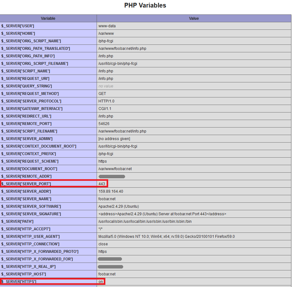 Посмотрите раздел PHP Variables. Для переменной SERVER_PORT задано значение 443 и протокол HTTPS включен, как если бы осуществлялся прямой доступ к Apache через HTTPS. При такой настройке переменных не нужно специально настраивать приложения PHP для работы за обратным прокси-сервером.