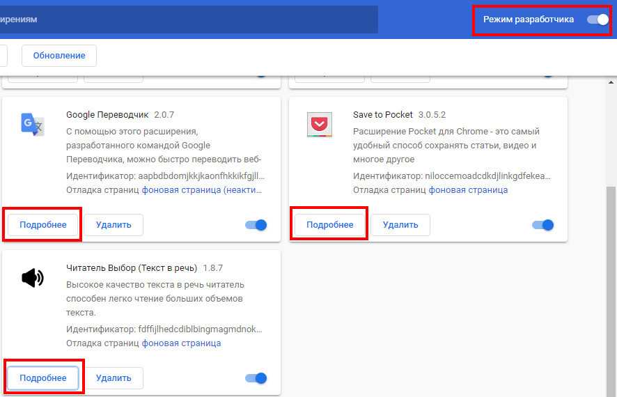 - Справа сверху страницы переводим тумблер «Режим разработчика» в активное положение.