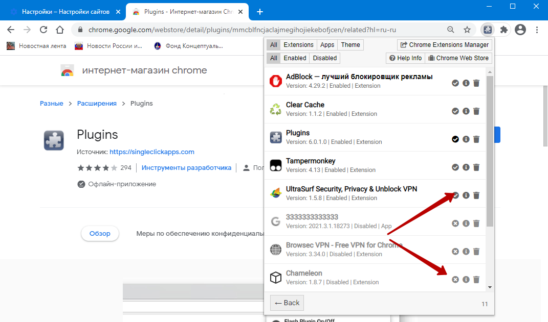 Настройка некоторых плагинов в меню браузера