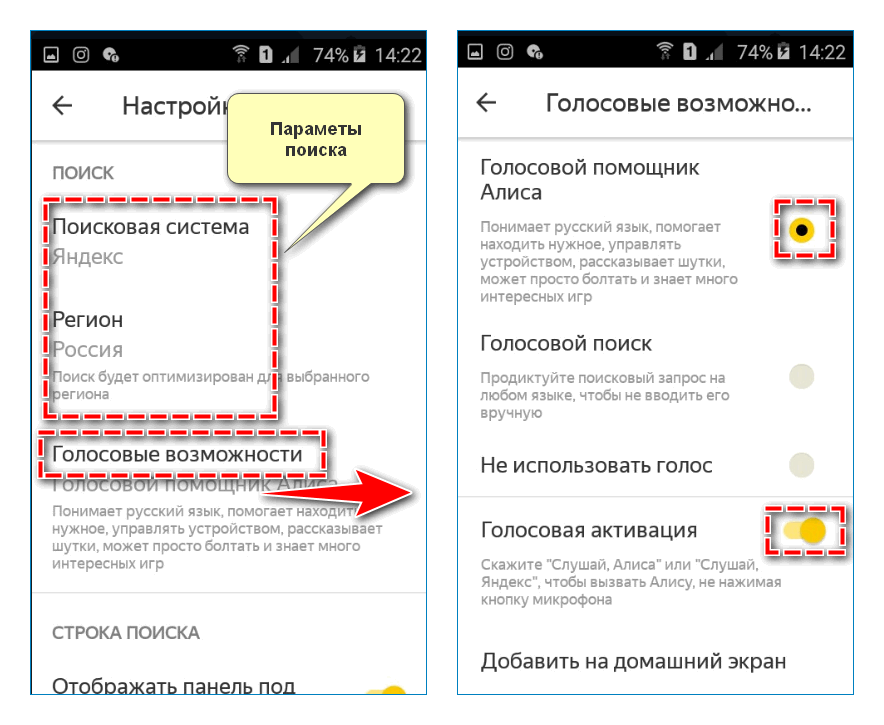 Здесь можно поменять кодовую фразу для активации (пункт «Фраза для вызова помощника»), настроить фильтрацию выдаваемого контента (пункт «Режим поиска»), а также разъединить девайсы в разделе «Отвязать устройство».