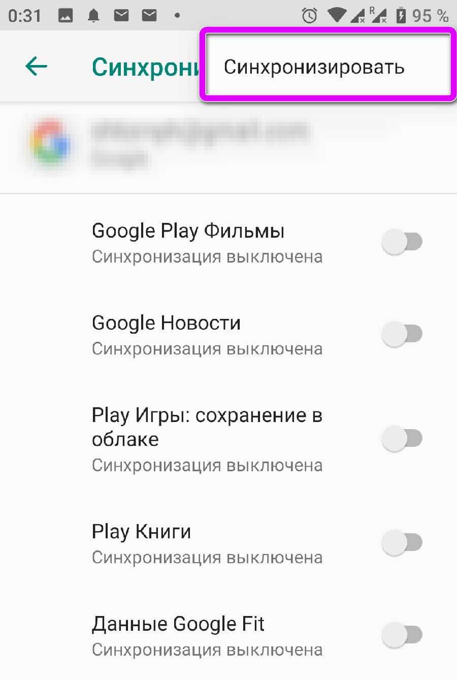 Переводим все ползунки в неактивное состояние. Чтобы изменения вступили в силу, нажимаем на иконку с тремя точками и в контекстном меню тапаем на «Синхронизировать».