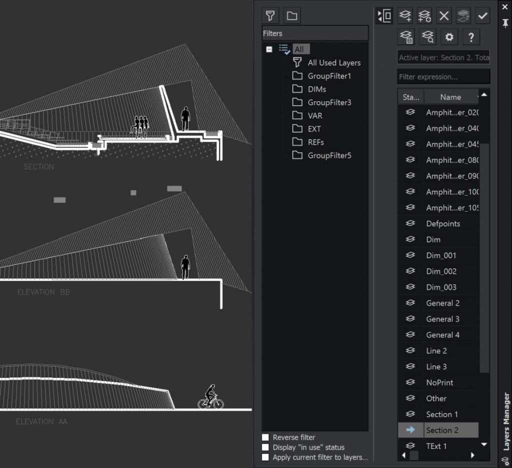 Теперь инструменты управления слоями доступны из чертежного интерфейса. Панель слоев можно использовать для объединения нескольких слоев в слой назначения.