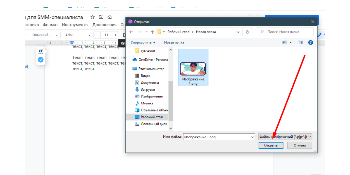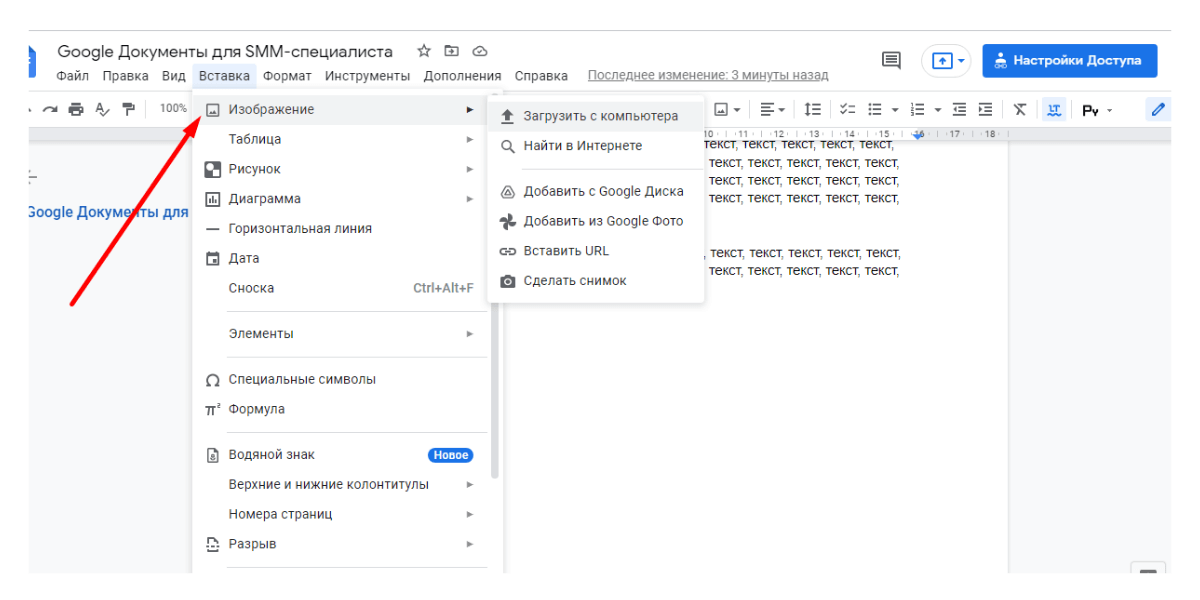 Иногда нужно добавить в текст фото, картинку или график. Например, чтобы показать визуал команде или отчет клиенту. Для этого перейдите в меню «Вставка».
