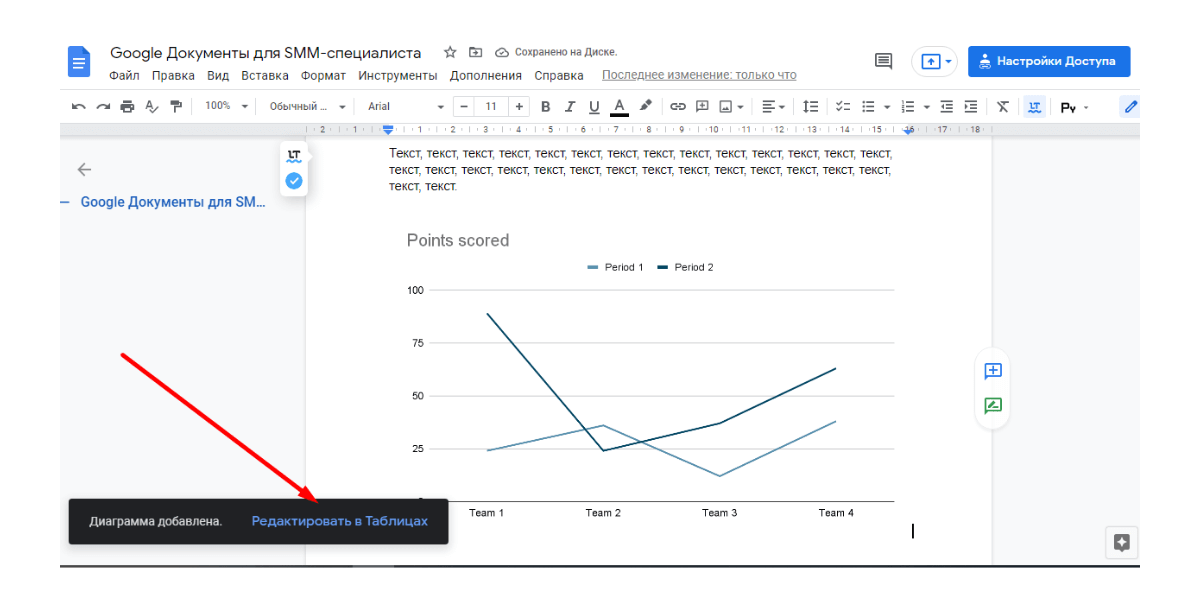 В документе появится график. Чтобы добавить нужные данные, его можно открыть в Google Таблицах.