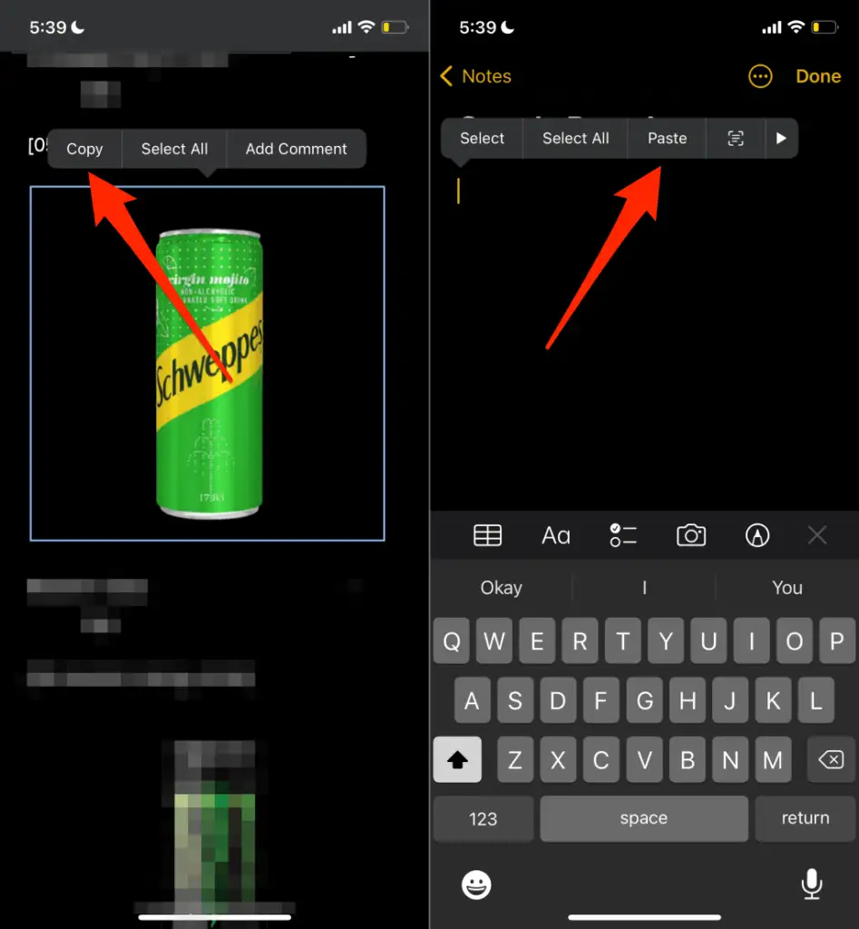 - Откройте приложение «Заметки» и вставьте изображение в новую или уже существующую заметку. Нажмите и удерживайте пустое место в заметке и выберите Вставить.