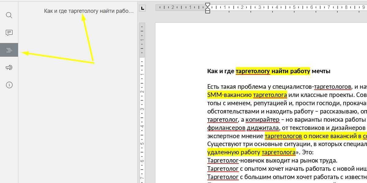 Пункт левого меню «Навигация» покажет все заголовки, которые есть в тексте, для быстрого перехода к нужному фрагменту.