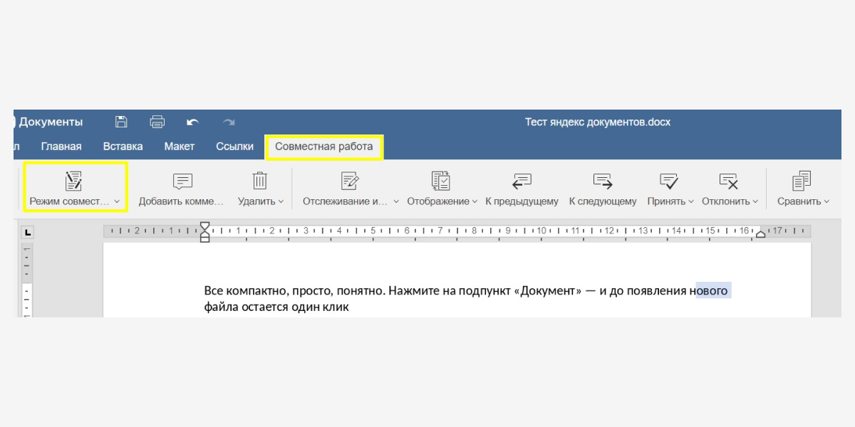В этой вкладке онлайн-редактора Яндекса можно выбрать пункт «Режим совместной работы»