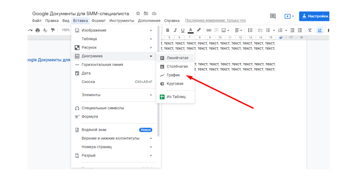 Например, вы выгрузили отчет из сервиса аналитики DataFan в Google Таблицы, а теперь графики нужно вставить в Гугл Докс, чтобы дописать сопроводительный текст. Откройте меню «Вставка», выберите Диаграмма → График.