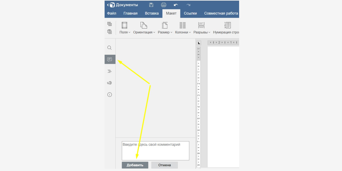 Инструмент «Комментарии» открывает форму, в которой можно оставить комментарий к тексту.
