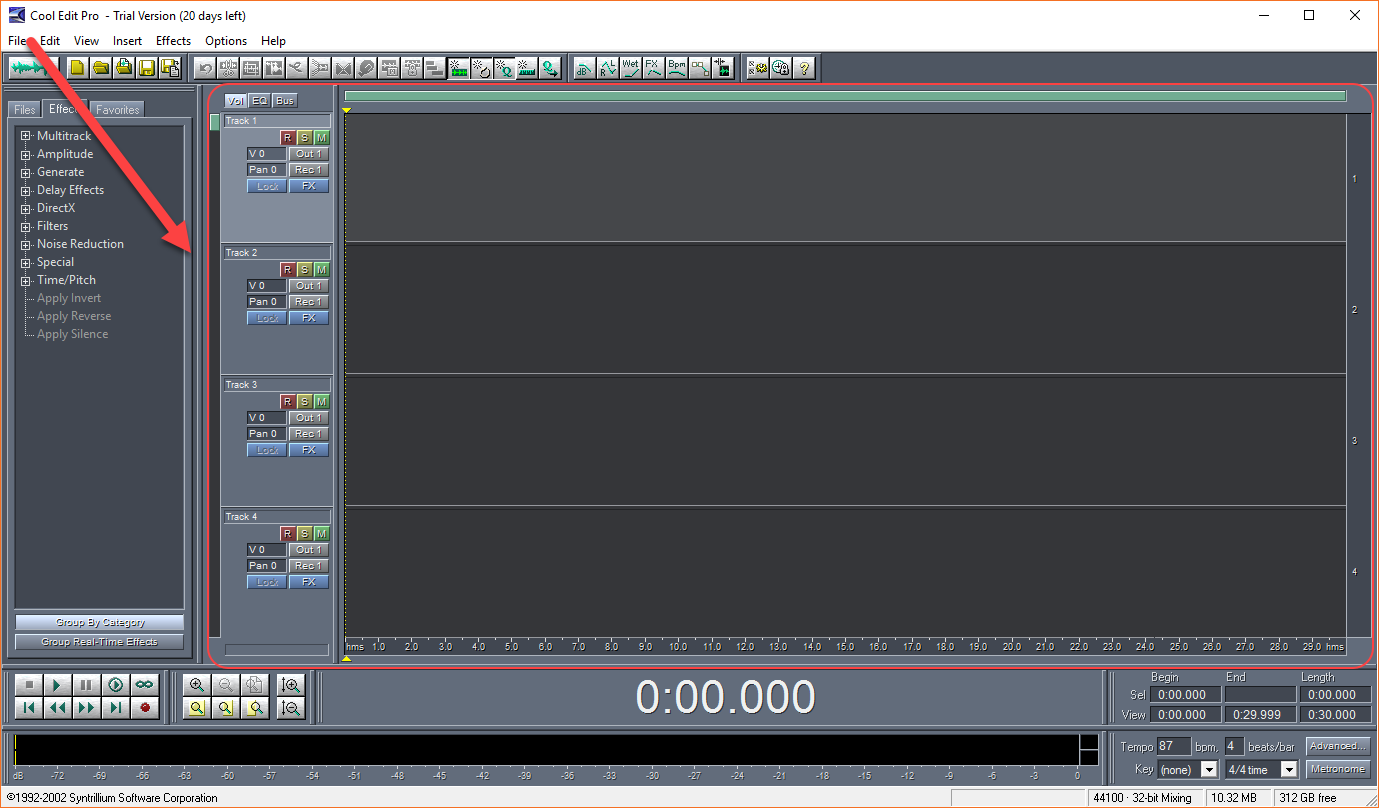 Главную и большую часть всего окна занимает сам тайм лайн. Он же является временной шкалой. Здесь и происходит основное действие, сведение треков. Их обрезание, склеивание, наложение эффектов и так далее. Максимально в этом софте можно создавать до 64 дорожек и сводить их между собой.
