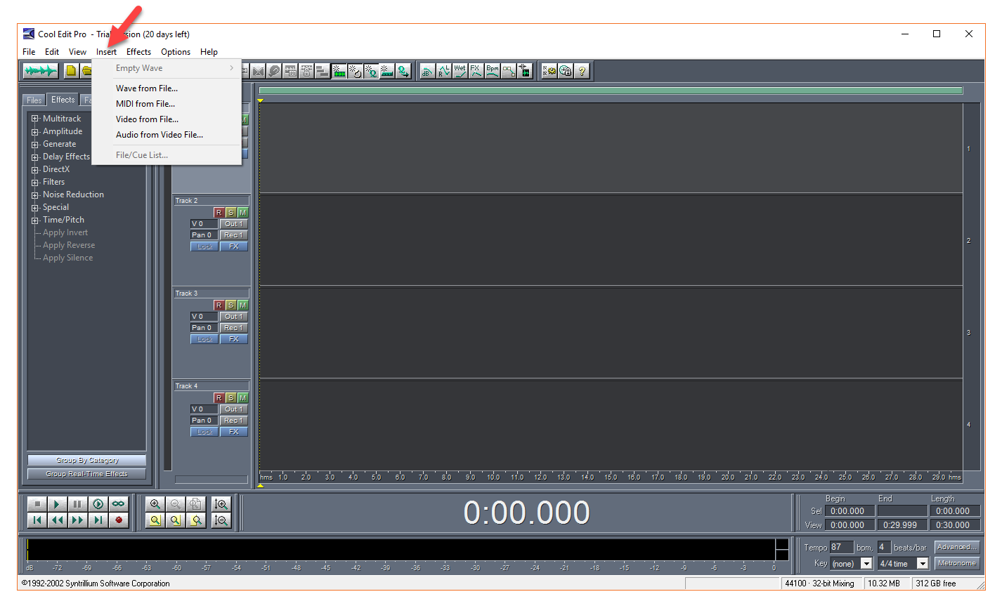 Первый пункт позволяет открывать, создавать проекты. Также сохранять сами дорожки. В софте уже на тот момент была возможность создавать отдельные проекты, сохранять их до завершения работы, а потом открывать из файла и продолжать её.