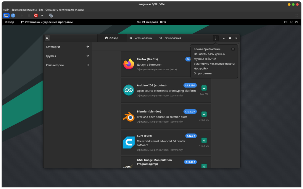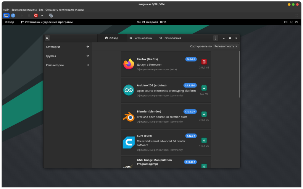 Все это крайне похоже на магазин приложений в смартфонах на Android, так что проблем с установкой и удалением программ возникнуть не должно. В менеджере приложений Discover который идет с рабочим окружением KDE все действия примерно такие же.