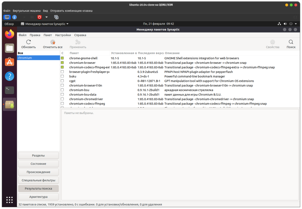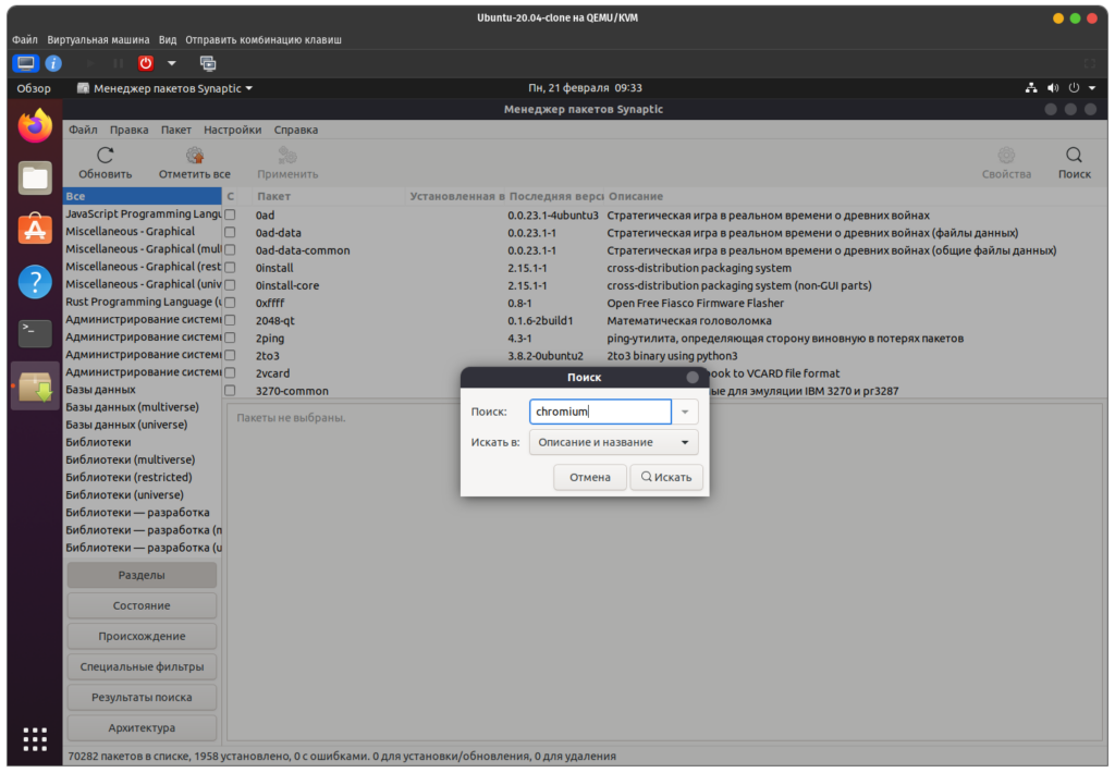 Устанавливать программы или пакеты можно через графические менеджеры программ, рассмотрим пример установки в Synaptic. Открываем его и в поисковой строке вводим название необходимой программы, например, нужно установить браузер Chromium, вводим его название: