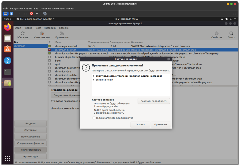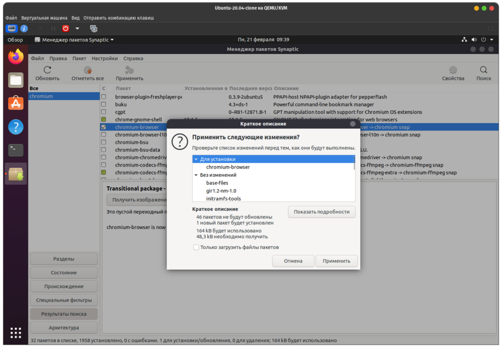 Вверху Synaptica появится кнопка “Применить”, нажимаем на нее, появится окно где можно увидеть что помимо самой программы, подтянутся и необходимые зависимости если их нет в системе: