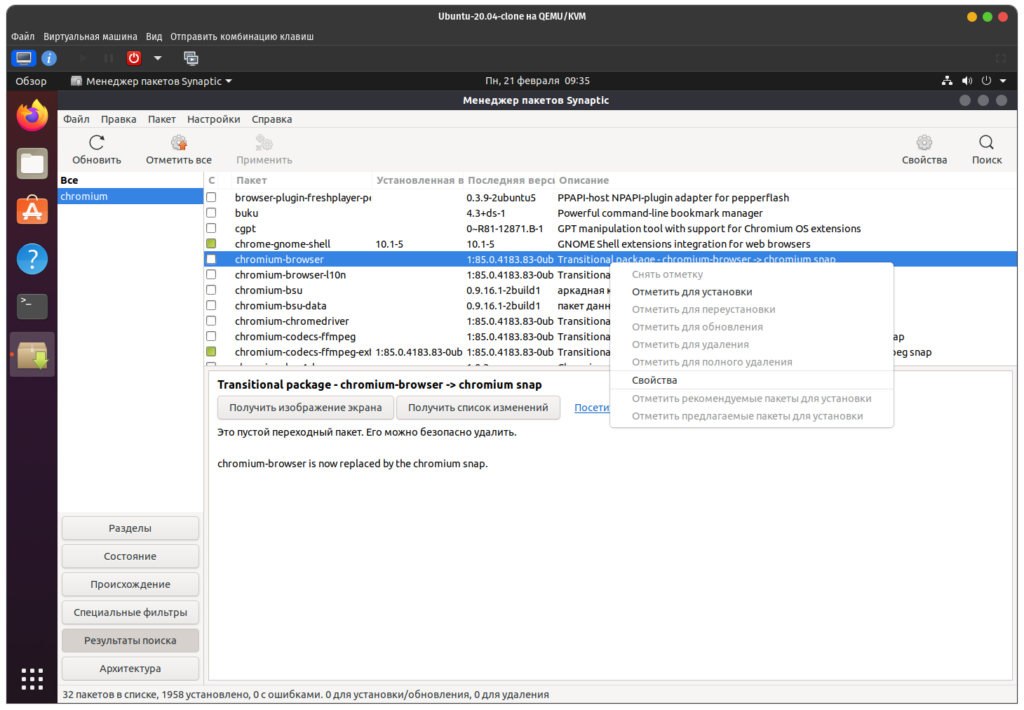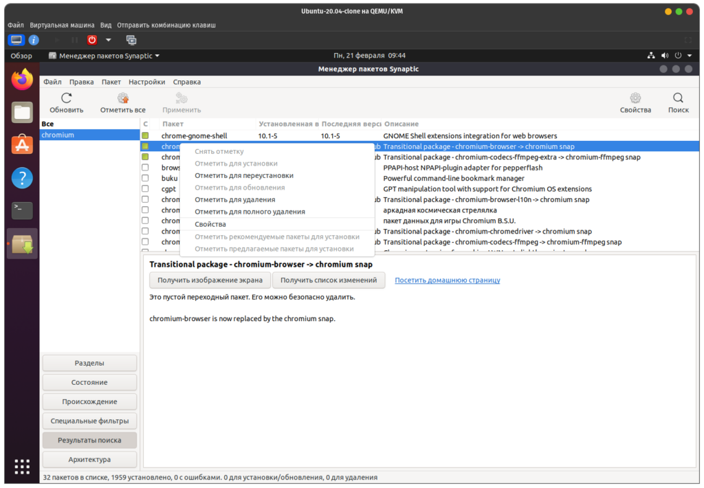 Для удаления программ в Synaptic нажимаем правой клавишей мышки на пакете, возьмем для примера все тот же Chromium, и выбираем один из пунктов “Отметить для удаления” или “Отметить для полного удаления”, в последнем случае, программа удалится со всеми ее зависимостями: