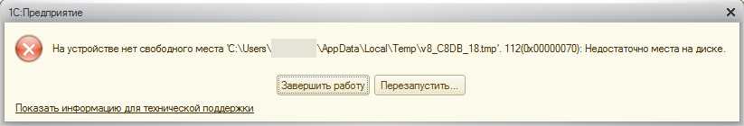 Ошибка : На устройстве нет свободного места ‘C:\Users\POS-PC\AppData\Local\Temp\v6_0095_d.tmp’ 112(0x00000070). Недостаточно места на диске