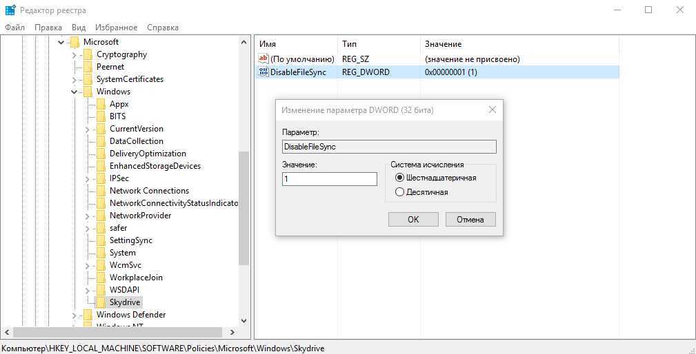 - Запускаем редактор реестра windows (win+R команда regedit) и меняем атрибут по адресу HKEY_CURRENT_USER\\SOFTWARE\\Microsoft\\Windows\\CurrentVersion\\Group Policy Objects\\Machine\\Software\\Policies\\Microsoft\\Windows\\OneDrive на 1 (если его нет можно создать с типом dword)———————————————————————————————